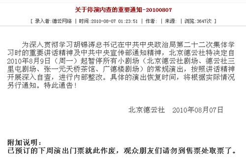 這個7日凌晨1點多發布的通知里提到,為深入貫徹學習有關精神,北京德云社特決定自2010年8月9日(周一)起暫停所有小劇場(北京德云社劇場、德云社三里屯劇場、張一元天橋茶館、廣德樓劇場)的常規演出,按照講話精神開展深入自查,進行內部整改。具體的演出恢復時間,將根據實際情況另行通知。已預訂的下周演出門票,就此作廢。