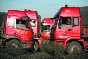 10點30分,記者驅車來到京藏高速張家口服務站1公里處,高速下的207國道被堵得嚴嚴實實,馬路上三條道排滿了運煤大貨車,記者停車翻越護欄來到橋下,腳踩之處,灰塵厚約3厘米!扒懊婢褪侨f全站,大貨限制上京藏高速。”據一名馮師傅介紹,他的車上拉有39噸煤,19日從內蒙古東勝出發,經110國道,22日晚12時到達這條堵塞路段,“10多個小時,到現在也就前進了2公里。你往北走,后面堵了至少七八公里,后面還有更多煤車跟上來!