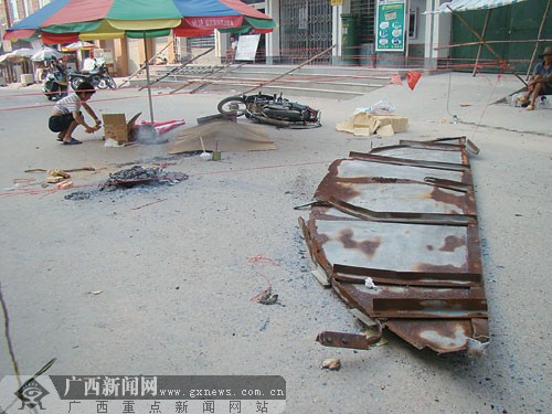 1日下午4時(shí)許,記者來到沙陂鎮(zhèn)街上,只見郵政儲(chǔ)蓄所沙陂營業(yè)廳門前停放著一具尸體,一張席子遮蓋在上面。旁邊有一塊鐵板和一輛翻倒的摩托車,地上擺放著紙錢、香等祭品。該廳的樓頂上安裝有一個(gè)信號(hào)發(fā)射塔,塔的周圍有幾個(gè)用鐵板做成的平臺(tái),最下面那個(gè)大平臺(tái)缺了一塊鐵板。