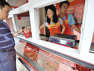 劉卓負責站柜臺。“她脾氣好,就算有一兩個挑剔的顧客,她一笑,別人就不好發火了。”劉卓是一個很清秀的女孩,笑起來甜甜的。賣鴨脖子其實利潤并不高,10塊錢的鴨脖子,只能掙2塊錢,再遇上幾個要求“抹去零頭”的顧客,掙的就更少了。“除去房租,還有一個月得七八百的水電費,一年還要交8000塊的加盟管理費。起步的確蠻難的。”閆振綱說。