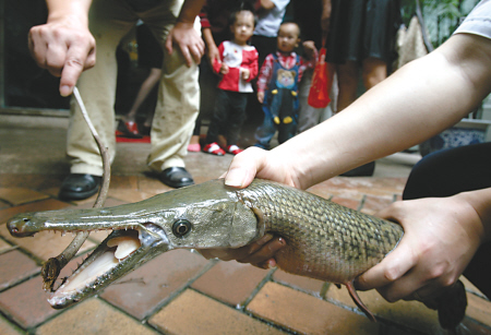 雀鱔來自北美或中美,目前生活于美國南部湖泊、中美等熱帶河流地區,據報道,它最長可達6米,能吃下人類。由于雀鱔是一種食肉魚,食量大很兇猛,因此被列入世界十大兇猛淡水魚類之一,與食人魚齊名。不過雀鱔肉可以食用,但其卵有劇毒,一旦人誤食可能致命。(記者 王玨)