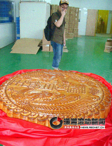 這個月餅外邊是金黃色的,放在一個鐵架上,上面雕了一龍一鳳,色澤鮮亮,工作人員拿小月餅和它比較,猶如巨人與小人站在一起。