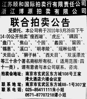 “焦山”、“瘦西湖”、“虎丘”、“明孝陵”……杭州一家公司搶注以30多個(gè)著名景點(diǎn)為名的商標(biāo),并且本月28日下午,江蘇頤和國(guó)際拍賣行有限責(zé)任公司和浙江博源拍賣有限公司,將在南京聯(lián)手拍賣。但讓人頗感驚訝的是,記者昨天聯(lián)系了這些景點(diǎn),居然鮮有知道自家景點(diǎn)被別人搶注成商標(biāo)同時(shí)即將被公開拍賣的!
