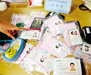 一進(jìn)門(mén),前臺(tái)值班人員高小姐熱情地詢問(wèn)是否丟失了什么東西。當(dāng)記者表明身份后,她大方地展示了這幾天收集到的一堆“成果”:身份證、銀行卡、錢(qián)包等等,記者粗略數(shù)了數(shù),大概有50多張身份證、20多個(gè)錢(qián)包,還有數(shù)不清的各種銀行卡。高小姐表示,“公司才開(kāi)業(yè)5天,這些東西都是環(huán)衛(wèi)工送來(lái)的,每件都有登記。”