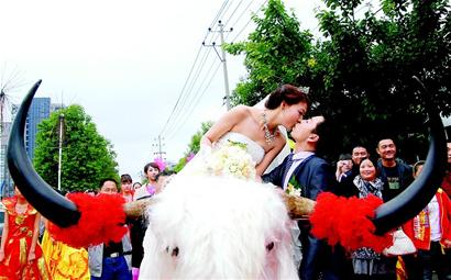 幾分鐘后,最后一輛婚車駛過,正當(dāng)大家還在回味那支豪車隊(duì)伍時(shí),一名男子牽著一頭壯實(shí)的白色牦牛走上了紅地毯。這頭牦牛雪白的長毛垂地,兩只牛角彎曲對(duì)稱,四肢粗壯有力,立即吸引了圍觀者的目光和鏡頭,現(xiàn)場(chǎng)只聽到“咔嚓”的快門聲和陣陣感嘆聲。“這頭牦牛價(jià)值十多萬元,專門用車從云南香格里拉運(yùn)送來的!”聽到有人問話,牦牛的主人小聲說。