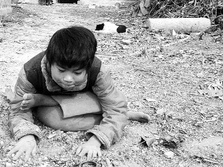 地上的小思思,一臉的麻木,正在扒土;記者走近,她“嘿嘿”笑了一下。思思的腰間,拴有一條用布條擰成的粗繩子。“一開始是用鐵鏈子拴住腳脖,后來磨出了血泡,沒辦法才用破衣服撕成條擰成繩子拴在腰間。”思思的奶奶李道榮說。