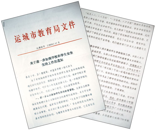 開會—發文—層層落實,這套慣用流程被運城多家學校稱為“十多年不變的模式”。幾年來,運城市教育局針對“學平險”多次發文、開會,而外界批駁之聲不絕于耳。