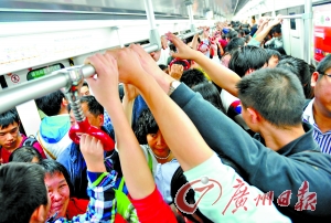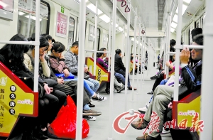 ②4日的體育西路站,車廂內(nèi)的乘客擁擠不堪。記者喬軍偉攝