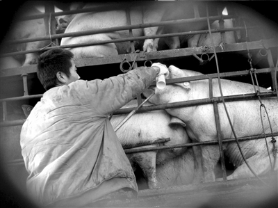 近日,本報接到舉報稱,在東六環施園北橋下的高速路應急車道上,有不法生豬商販給生豬注水。記者經過暗訪掌握了兩家供應商制造“注水豬”的過程,并發現這些“注水豬”被運至通州區潞城鎮工業園區的大紅門肉類食品有限公司(以下簡稱肉食公司)。