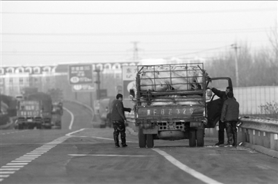 12月1日下午,根據讀者提供的線索,記者前往事發地探訪。當天下午3點整,現場十分平靜,應急車道上留有一些水跡和動物糞便。3點40分,一輛車牌號為冀FA1809的藍色貨車由南向北緩緩駛來,該車打開雙閃燈后,停靠在施園北橋下的應急車道。該貨車后斗內分成上下兩層運輸艙,里面擠著七八十頭體形較大的生豬。所有豬的一側耳朵上都戴著一個圓形耳標。據了解,戴有這種耳標的生豬表明其已經過動檢部門的檢疫。