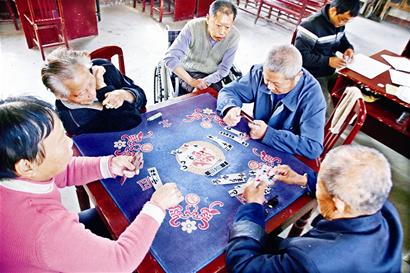 一間屋子門口,幾位老人正在聊天,另一間屋子里,幾位老人在打紙牌。