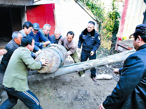 最大的航空炸彈系侵華日軍遺留 8條大漢合力抬它上卡車