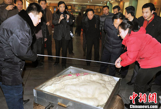 12月22日是中國的傳統節氣冬至,吃餃子是幾千年來的傳統習俗。河北保定曲陽縣的鄭記餃子館特制了一個超級特大水餃。圖為公證處人員在現場測量,進行公證。中新社發 劉向陽 攝