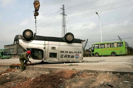 撞上運鈔車的是長樂江田至福州市區的一輛客運車,車號牌為閩AZ5756,停在現場的路邊。客運車后面一條將近四十米的剎車痕清晰可見,前擋風玻璃破了。而被撞的運鈔車四輪朝天,躺在對面車道上。