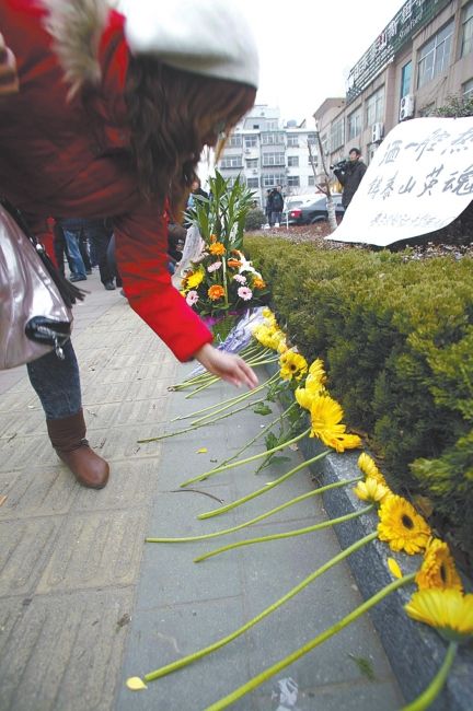 山東農(nóng)業(yè)大學、泰山醫(yī)學院的學生代表,也紛紛準備了鮮花、自制的紙花,以及他們親自書寫的寫有“人民英雄,一路走好”、“愿逝去的英魂安息”等字樣的挽聯(lián)。