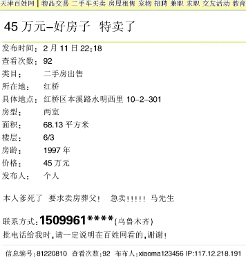 按照馬先生的介紹,記者打開(kāi)“天津百姓網(wǎng)”,在二手房出售的類別中,內(nèi)容為“賣天津市紅橋區(qū)本溪路永明西里某住房,45萬(wàn)元”,并注明“本人爹死了,要求賣房葬父!急賣。。!”發(fā)布人:xiaoma123456,時(shí)間:2月11日22時(shí)18分,IP地址為117.12.218.191,留的聯(lián)系方式是馬先生的手機(jī)號(hào),并注明是烏魯木齊的手機(jī)號(hào)。