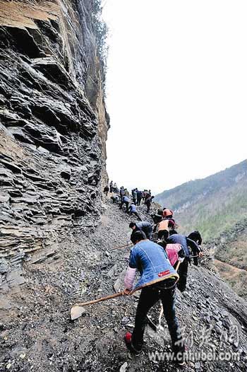 昨日11時17分,爆破聲后,碎石和粉塵緩緩落定,高山深谷阻隔的建始縣龍坪鄉店子坪村再次回到寧靜中。村支書王光國和60多名村民回到百米高的懸崖上,鋤頭、鋼釬和勞動號子又響了起來。