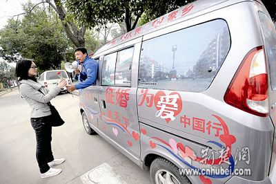 “征婚游天下,為愛中國行。”昨日上午,一名黑龍江男子開著一輛面包車,來到武漢大學門口吆喝。這哥們不是開婚慶公司的,也不是為“相親節目”搖旗吶喊,而是走遍全國為自己征婚的金英奇。