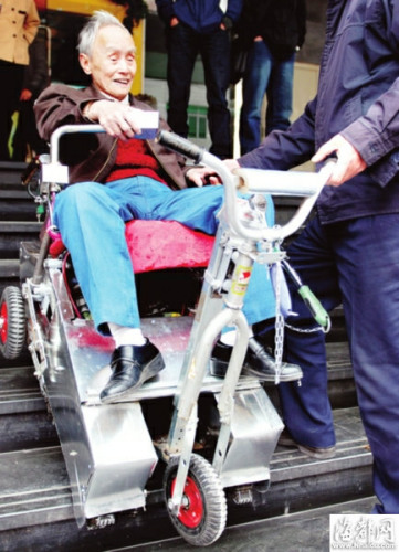 記者看到,這車上樓梯時,把在平地用的大輪子收起,讓履帶曲面緊咬階梯,通過電機轉動帶動輪子往上爬。爬樓梯過程中,坐椅可調整斜度,保持乘坐者平穩。另外,車子還可原地轉圈,再小的樓梯拐角都能通過。據了解,省老科協將這一實用型發明產品推薦到今年“6·18”項目成果交易會上,力促企業投資生產。(海峽都市報 見習記者 湯先增)