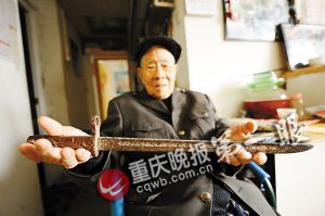 尹泰邦老人捧著的這把刺刀是妻子丁素蓮從日本鬼子手中奪過來的
