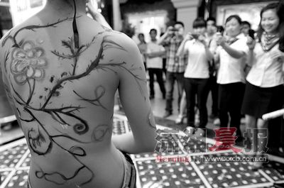 女模特赤裸上身坐在人群中間,兩名畫師正在其身上作畫……昨日下午,一場人體彩繪秀在芙蓉區萬家麗中路68號上演。這一大膽舉動吸引了不少行人的眼球,現場一個5歲小男孩剛要湊熱鬧,一旁的母親趕緊將兒子的眼睛捂住。