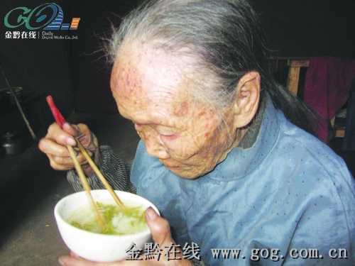 103歲的李友珍老人正在吃茶水泡的飯。
