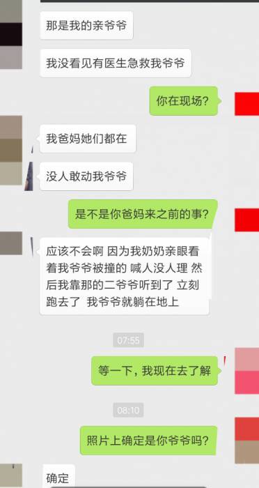 6月22日早上,一名自稱是傷者孫女的女孩與網(wǎng)友聊天的信息公布于眾,女孩稱:她并沒有看到有醫(yī)生急救她爺爺,她爸媽都在現(xiàn)場(chǎng),是沒有敢動(dòng)爺爺?shù)摹2⒎Q,如果真有醫(yī)生幫及時(shí)簡(jiǎn)單處理一下,爺爺說不定會(huì)活下來。