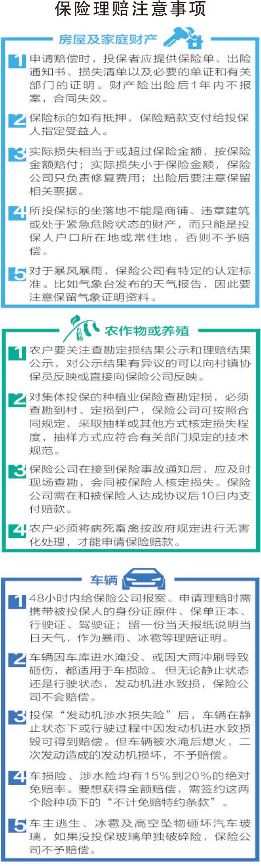 各種政策性及商業保險,在災后保障中發揮越來越大的作用。面對此次洪澇災情,中國保監會要求各保監局、各保險公司完善重大災害理賠工作預案,優先處理災區理賠事項,對于災害理賠中的拖賠、惜賠等行為,將嚴查重處。至7月上旬,湖北安徽已接保險報案5萬多件。