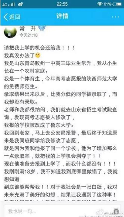 8月1日深夜,多位青島膠州的朋友向半島記者爆料,青島膠州一中一位叫做常升的高三考生,今年報考陜西師范大學的免費師范生,但志愿竟然被人偷偷篡改,結果導致自己上不了大學!這位考生懷疑是自己的同班同學偷改了他的志愿,這位同學報考了和他一樣的大學,分數比他還要低,結果這位同學被陜西師范大學錄取,而自己等來等去,沒有錄取結果,上網一查,才發現自己的志愿已經被改了!