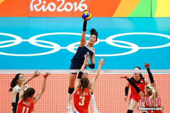 當(dāng)?shù)貢r(shí)間8月18日,2016里約奧運(yùn)會(huì)女排半決賽,中國(guó)隊(duì)對(duì)陣荷蘭隊(duì),3:1淘汰對(duì)手。圖為朱婷在比賽中。中新網(wǎng)記者 富田 攝