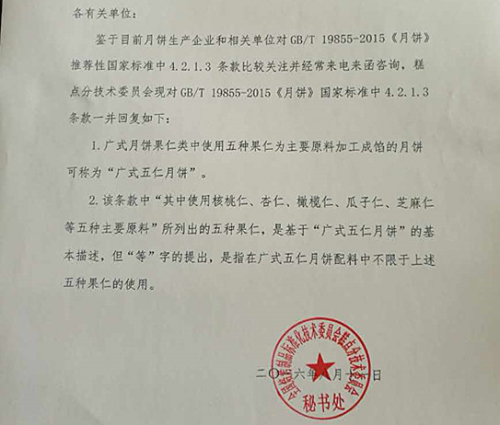 對此,全國焙烤制品標準化技術委員會糕點分技術委員會在函件中解釋稱,“等”字的提出,是指在廣式五仁月餅配料中不限于上述五種果仁的使用。