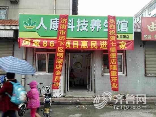在簡單的面試后,記者被安排到了濟南歷城區南全福小區的店面上班。第二天早晨,記者來到了這家店面,這家店牌子上寫著人康科技養生館,還拉著條幅,上面寫著“國家863項目惠民進萬家”。在店面門口有很多中老年人。