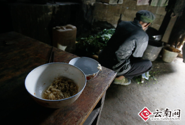 行走10余分鐘后,何應梅在一棟用石塊和磚塊磊成的房屋前停下腳步。這是今年已88歲的楊有詳老人的家。楊有詳剛吃過午飯,一個人蹲在墻面被煙火熏黑的廚房里切番薯葉,他養了一頭豬。神情落寞、呆滯,有人走進來,老人似乎也沒有察覺,自顧自地切著番薯葉。