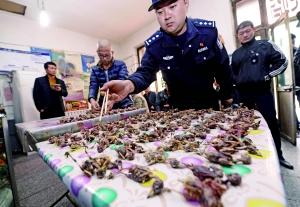 昨天,市園林局森林公安局與執法監察大隊聯手, 分14路突擊通州、大興的鳥市、果園和餐館,查處捕獵和售賣野鳥的違法行為。
