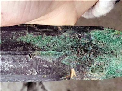 二是劍身呈黑色的地方為黑漆古,黑漆古是由于古銅長(zhǎng)期存放在潮濕的地方,其表面生成的一層極穩(wěn)定的保護(hù)薄膜,重慶地區(qū)潮濕,劍身有黑漆古出現(xiàn)是合乎常理的。