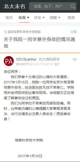 京華時報訊(記者 葉丹穎)記者獲悉,1月16日,北大信息科學技術學院一名研究生在京外一家滑雪場意外受傷,經(jīng)送醫(yī)搶救無效身亡。該學院研究生會于次日凌晨在北大BBS論壇發(fā)布情況通報證實此事。然而,事發(fā)地警方及宣傳部門均稱對此事不知情。