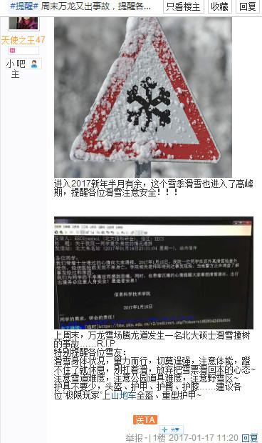 1月17日下午,一位用戶轉載此帖并稱:“據(jù)雪圈里一些道聽途說的消息,遇難者是有一定技術的,去年還參過賽,這次是和三個朋友一起去的。頭盔也戴了。事發(fā)地點在崇禮縣萬龍滑雪場,遇難者‘在沒有運動員證的情況下’上騰龍道(一條很陡的道)并練習旗門技術,在過完旗門后速度太快沒有及時剎住,滑進了樹林里并撞到了樹上。”