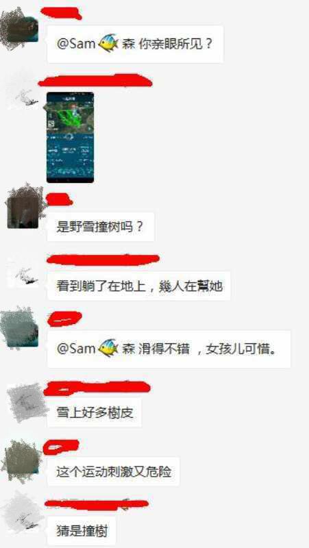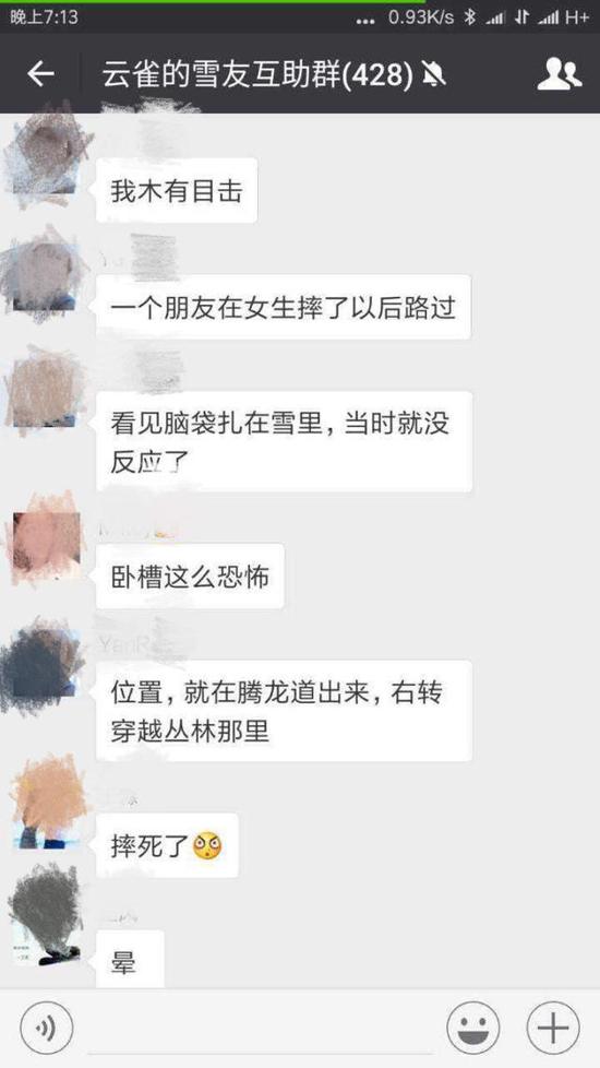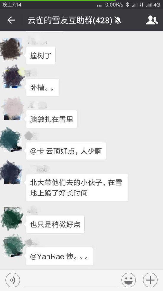 京華時報記者在百度貼吧單板滑雪吧內搜帖發(fā)現(xiàn),一位網(wǎng)名為“天使之王47”的網(wǎng)友于1月17日中午發(fā)帖稱“萬龍雪場騰龍道發(fā)生一名北大碩士滑雪撞樹的事故”,并上傳了多張名稱為“云雀的雪友互助群”的群聊截圖,聊天記錄中顯示“撞樹了”、“腦袋扎在雪里”、“雪上好多樹皮”、“位置,就在騰龍道出來,右轉穿越叢里那里”等描述。