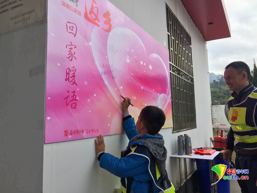 小龍今年8歲,在廈門讀小學(xué)一年級(jí)。今年第一次跟爸爸媽媽三個(gè)人一起騎車回江西寧都老家。想到下午就可以到家了,跟家里的姐姐、弟弟們一起玩了,他高興地在“鐵騎返鄉(xiāng)”留言墻上畫了一個(gè)甜甜的笑臉。中石油福建分公司志愿者隊(duì)供圖