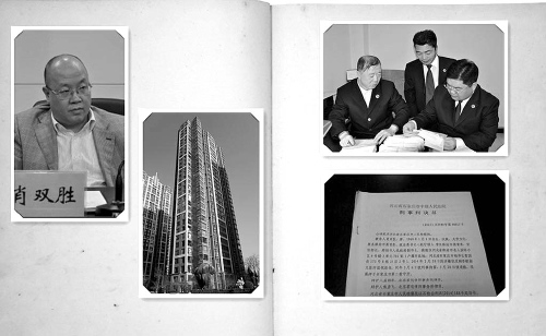 左上:肖雙勝其人;左下:肖雙勝超低價(jià)買房的樓盤;右上:辦案檢察官查賬;右下:一審判決書