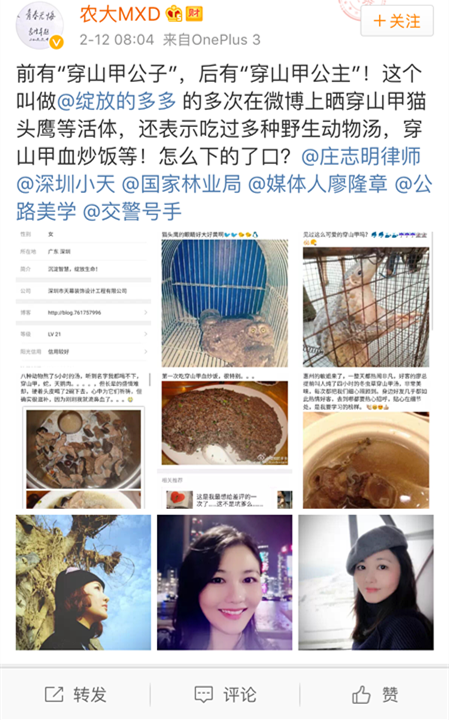 此人微博名為“綻放的多多”。微博注冊信息顯示該女為深圳某設(shè)計(jì)工程公司,具體職務(wù)不詳。從其微博看出,穿山甲、蛇、天鵝甚至貓頭鷹……該女子常年食用野味。