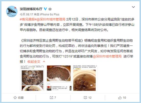 2月13日上午,廣東省深圳市互聯(lián)網(wǎng)信息辦公室官方微博“深圳微博發(fā)布廳”發(fā)布微博稱,12日,深圳市森林公安分局監(jiān)測到網(wǎng)友“綻放的多多”微博涉食用穿山甲等內(nèi)容,立即開展調(diào)查。當(dāng)天下午18時許該微博已自行將涉穿山甲內(nèi)容刪除。目前調(diào)查還在進(jìn)行中,相關(guān)調(diào)查結(jié)果將及時公布。