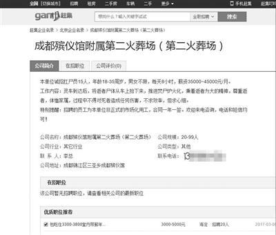 成都一家殯儀館工作人員介紹,他們目前僅有“運尸員”這一崗位,“但這個崗位屬于事業編制,招聘都是通過殯儀館官方網站進行的,還需要審查,不會隨意發在這些網站上!惫ぷ魅藛T同時介紹,即使是正規“運尸員”,也絕非高薪,“月薪過萬是不可能的,肯定是騙人的”。