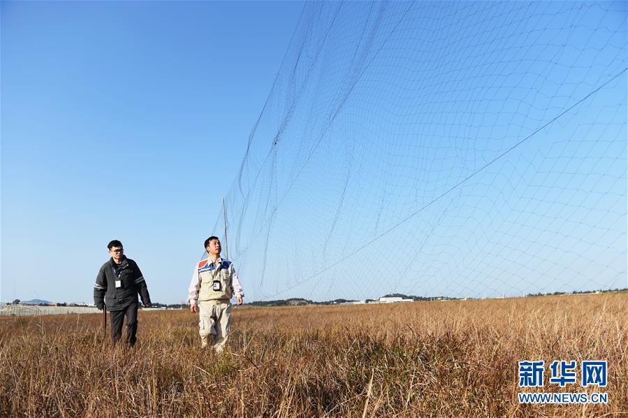 3月23日,福州空港建設(shè)管理部的鐘瑞鋒(左)和薛敬書(shū)在機(jī)場(chǎng)飛行區(qū)巡查攔鳥(niǎo)網(wǎng)。福州長(zhǎng)樂(lè)國(guó)際機(jī)場(chǎng)有一支驅(qū)鳥(niǎo)隊(duì),他們?yōu)榱吮Wo(hù)飛機(jī)起降安全,24小時(shí)全天候守護(hù)在機(jī)場(chǎng),注視著飛行區(qū)域的風(fēng)吹草動(dòng),擔(dān)負(fù)著空中“守護(hù)神”的職責(zé)。新華社記者林善傳攝