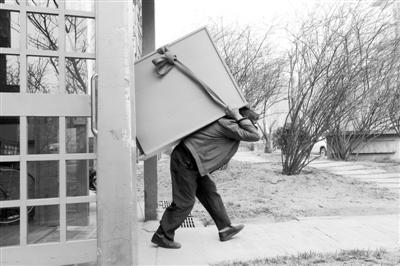 3月19日,庹師傅從北京五環(huán)外一棟居民樓里把衣柜背出來(lái),長(zhǎng)條綁帶包著衣柜更容易著力,但衣柜還是把他的腰壓得深彎下去。本報(bào)記者 吳凡 攝