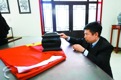 在骨灰領取處,魏童仔仔細細核驗骨灰盒上的逝者信息,并準備將骨灰盒包裹好交給逝者家屬。整個過程中,他都表情嚴肅莊重。