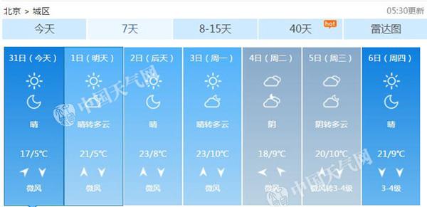 今天白天,北京以晴間多云為主,陽光充足,氣溫也隨時回升,最高氣溫在17℃左右。北京市氣象臺預計,今天白天北京晴間多云,午后到傍晚山區有分散性小陣雨,北轉南風二三級,最高氣溫17℃;夜間晴間多云,南轉北風二三級,最低氣溫5℃。