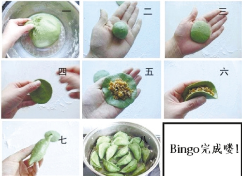 采“艾青”,煮“艾青”,搗粉團,做餡料,包青粿,完成后,上鍋去蒸熟就可以了。十幾分鐘后,飄散著怡人清香的清明粿就可以出籠啦!