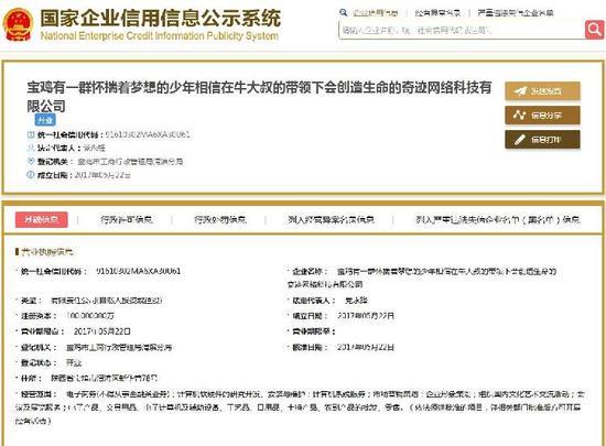 " 這么長(zhǎng)的公司名字,想要一口氣讀下來(lái),還真的是不容易啊。"8日,陜西寶雞一家剛剛注冊(cè)的公司爆紅網(wǎng)絡(luò),而爆紅的原因,是這家公司有一個(gè)長(zhǎng)達(dá)39個(gè)字的公司名--寶雞有一群懷揣著夢(mèng)想的少年相信在牛大叔的帶領(lǐng)下會(huì)創(chuàng)造生命的奇跡網(wǎng)絡(luò)科技有限公司。北京青年報(bào)記者從當(dāng)?shù)毓ど滩块T了解到,這家公司確實(shí)通過(guò)了工商登記,而公司負(fù)責(zé)人表示,這個(gè)名字來(lái)自于公司員工的突發(fā)奇想。