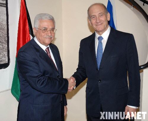 資料圖片:9月10日,以色列總理奧爾默特(右)與巴勒斯坦民族權力機構主席阿巴斯在耶路撒冷握手。當天,奧爾默特與阿巴斯和巴勒斯坦過渡政府總理法耶茲在這里舉行了會談。 新華社發